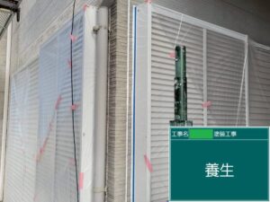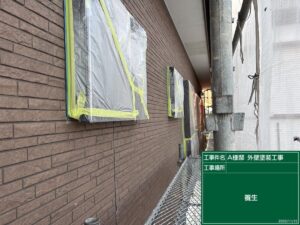 養生とは、塗料の飛散防止のために足場に取り付けるネットのことであったり、上の写真のように窓ガラスやサッシ、玄関ドアなどの塗料を塗ってはいけない部分を養生用ポリシートやマスキングテープを使って保護することです😎