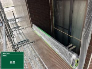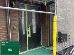 養生とは、塗料の飛散防止のために足場に取り付けるネットのことであったり、上の写真のように窓ガラスやサッシ、玄関ドアなどの塗料を塗ってはいけない部分を養生用ポリシートやマスキングテープを使って保護することです😎
