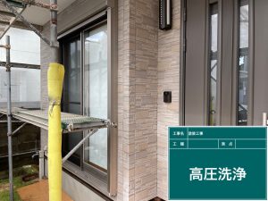 高圧洗浄機を使用して、ほこり・コケ・チョーキングの粉などを落とし、綺麗にする作業です。