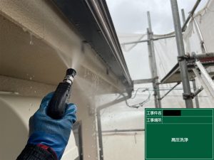 塗装の前に外壁や屋根にこびりついたコケや藻、カビホコリなどのあらゆる汚れを高圧洗浄器で洗い落としていきます。この作業を丹念にすることで塗料の性能が十分に発揮されます😄