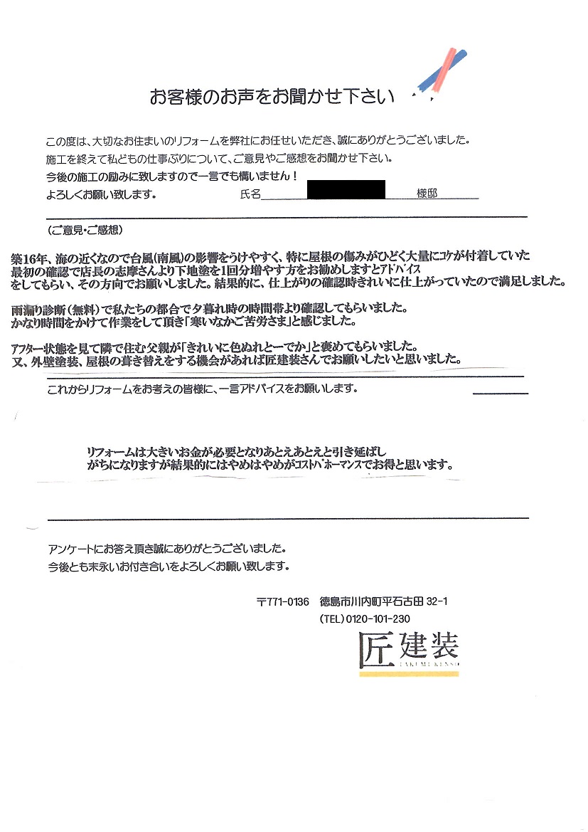 また、外壁塗装・屋根の葺き替えをする機会があれば匠建装さんでお願いしたいと思いました。